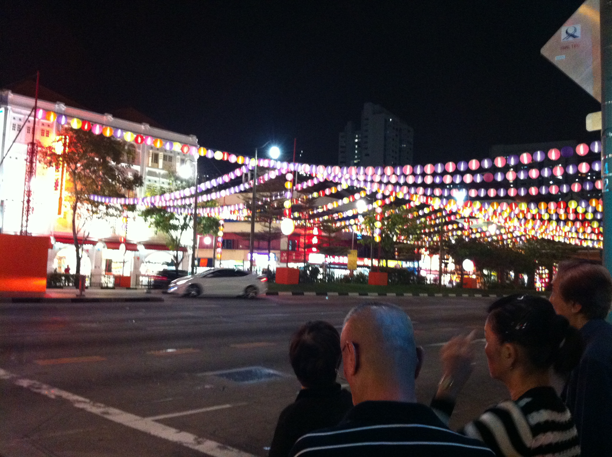 She was near my office in the Clark Quay area to pick up her employment pass. So, we met here and walked along the riverfront for a bit. There looked to be a lot of nice restaurants lined up along the water but they are pretty pricey. I’ll save them until after I get a paycheck. But, we discovered that neither one of us had eaten at a Hawker Centre yet, something a lot of locals have told me to do, so we decided to walk to Chinatown and check one out.  Here’s a picture of a street in Chinatown that we saw along the way. The streets were beautifully lit with an array of different colored paper lanterns.