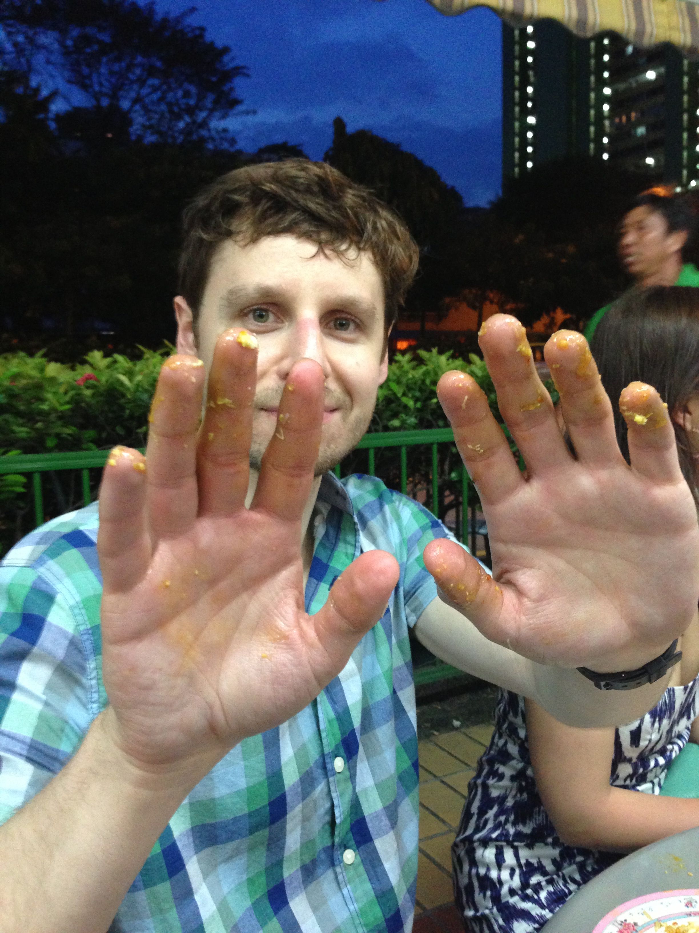 On the way there the cab driver fueled my insecurities when he said “why are you taking them there?” But, apparently I know my friends more than that grumpy dumbass because we all had a ton of fun and at the end of the trip that night’s meal was still listed as one of their favorites. Maybe it was the food, but more likely it was the excitement of old friends catching up after 8 months and the 18 giant Tiger beers. Here’s a picture of our group’s first fish eyeball consumed on the trip by the brave Tay.