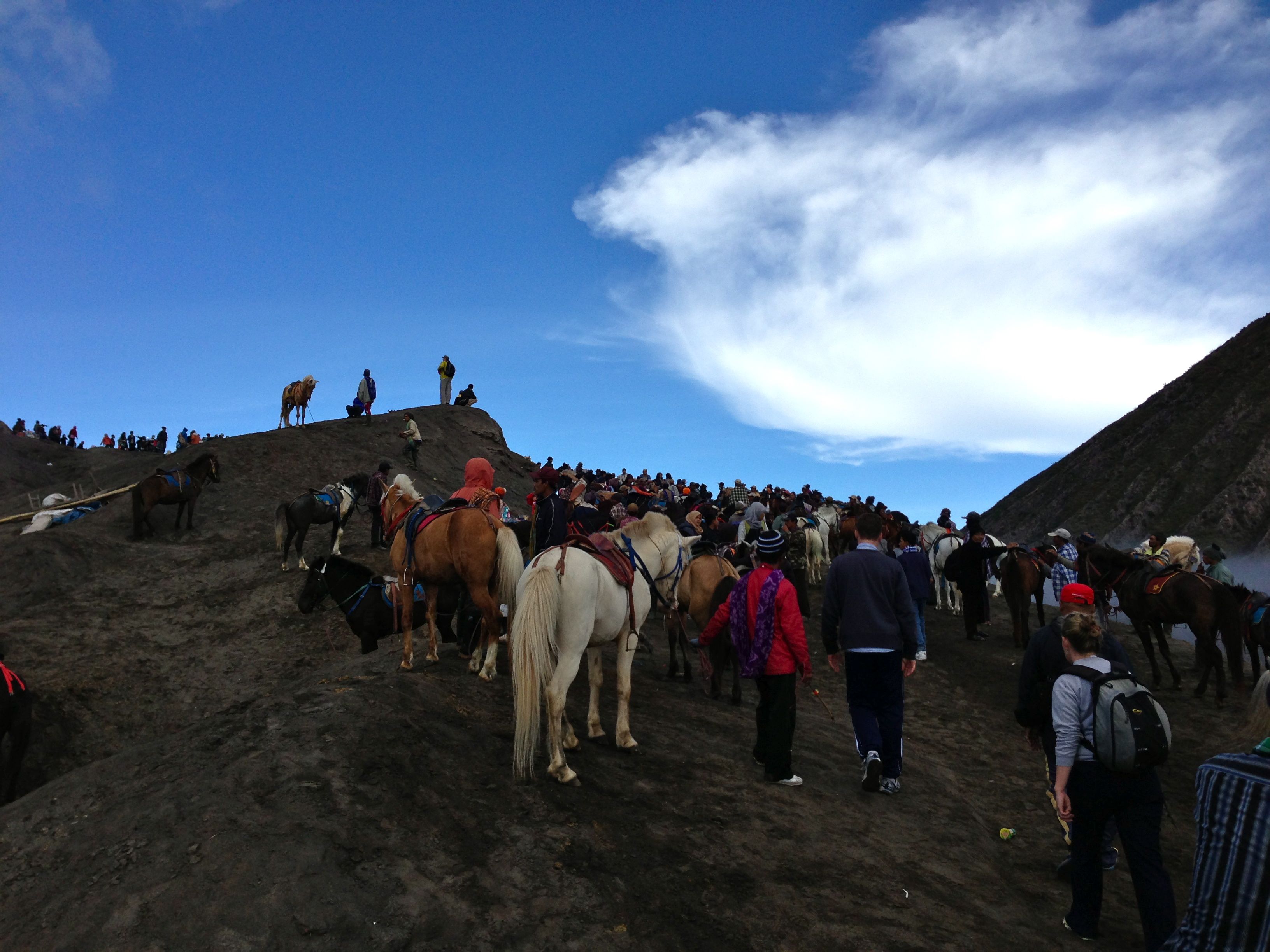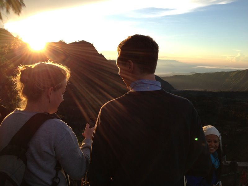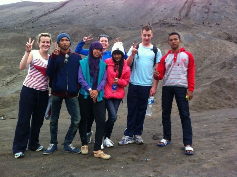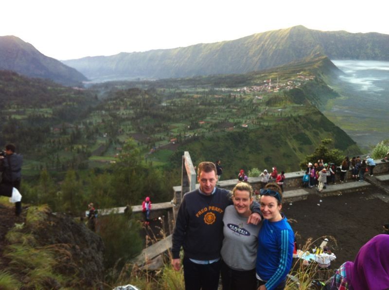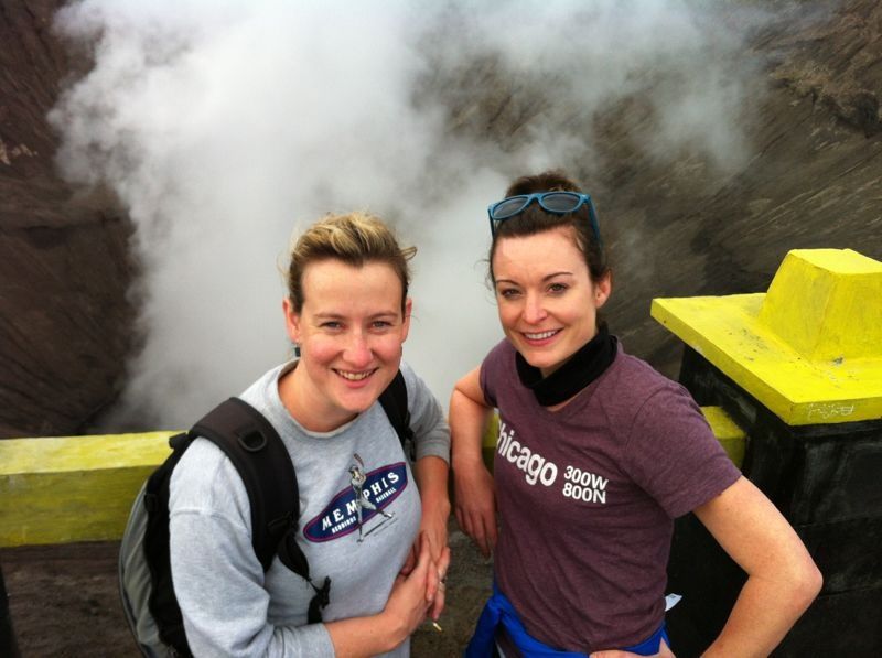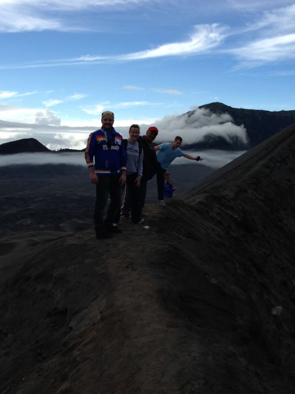 But, it didn’t really matter. We didn’t have much time to sleep. We got a 3 am wake up call, climbed in a 4WD and headed up to Mount Penanjakan to watch the sunrise over Mt Bromo, an active volcano that erupted last in 2011. It was another experience I will never forget. The scenery was breathtaking. The people were so happy and friendly. The village streets were lined with fresh fruit stands, misty mountains and rice fields. It felt like we were walking through a fairytale. Honestly, if you live out here and  want to do something totally different. Go to Mt. Bromo. You won’t regret it. If you don’t live out here and want to visit, I’ll go back with you. Once you see these pictures, you’ll understand why. bromoepic bromoepic2 bromo3 bromo2 craterbromo bromobrave2 bromopanarama bromo bromopony ourbromoride bromobellflowers bromoroomview sunriseroomies beautifulfriends 3ofusSunrise SulferB&K Bromorides BromoBrave   My Bromo buddies were much braver than me. They climbed up the side of this volcano while I clung tightly to the railing nearby. But, someone had to take the photo, right?