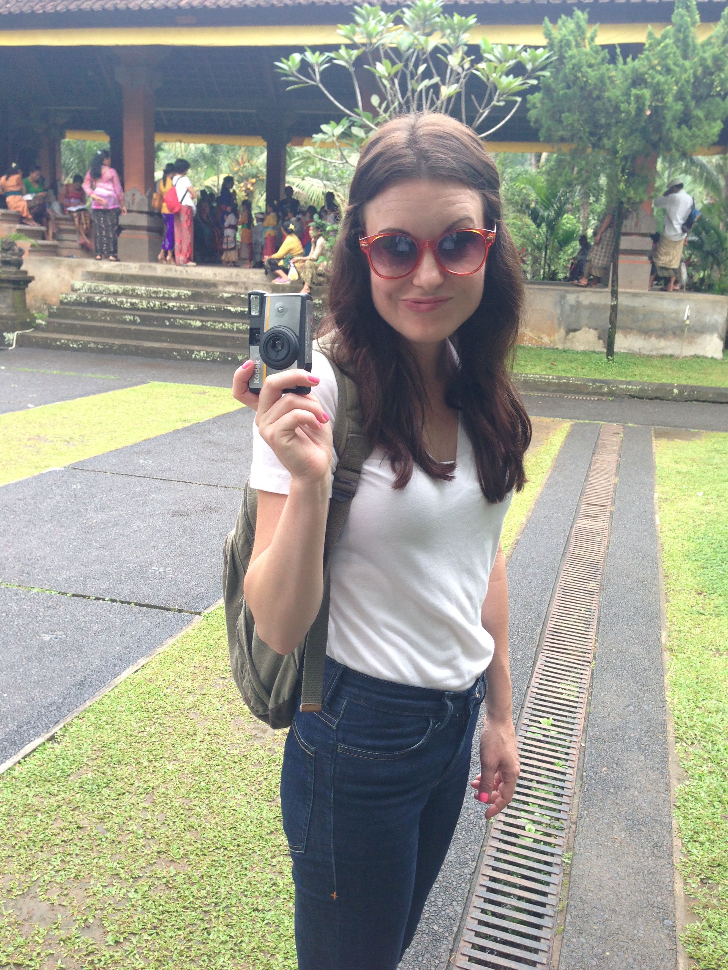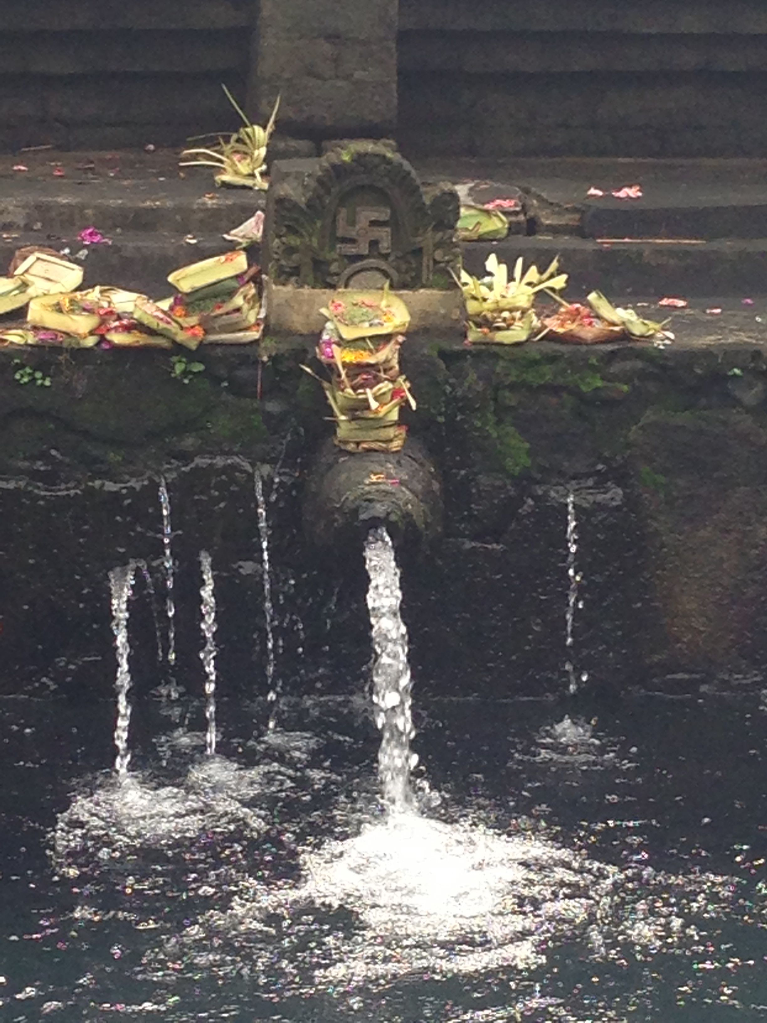 Karrie sprinkling holy water over her head before entering the temple.